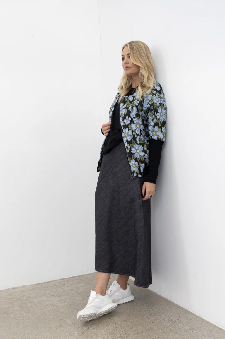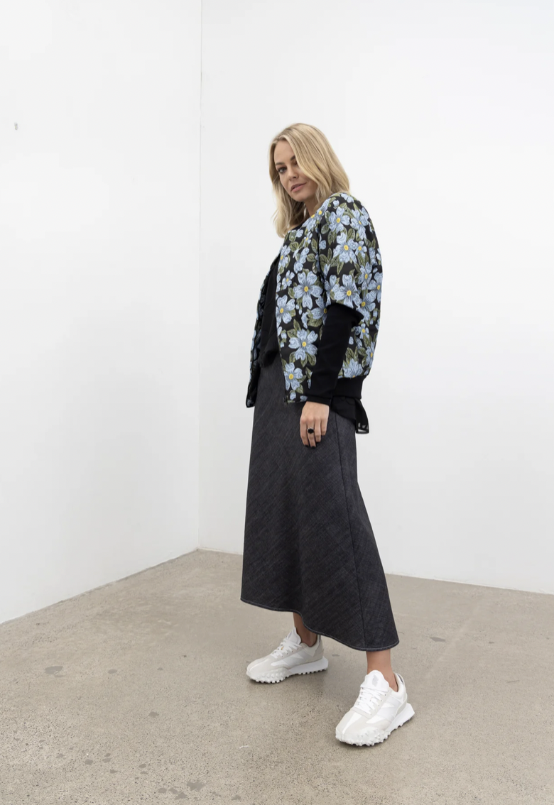 A functional and elegant bomber-style jacket. Our Rock Me Bomber is a floral applique that features an open-ended centre front zip, and side seam pockets to give relaxed look. Rib collar and waistband.