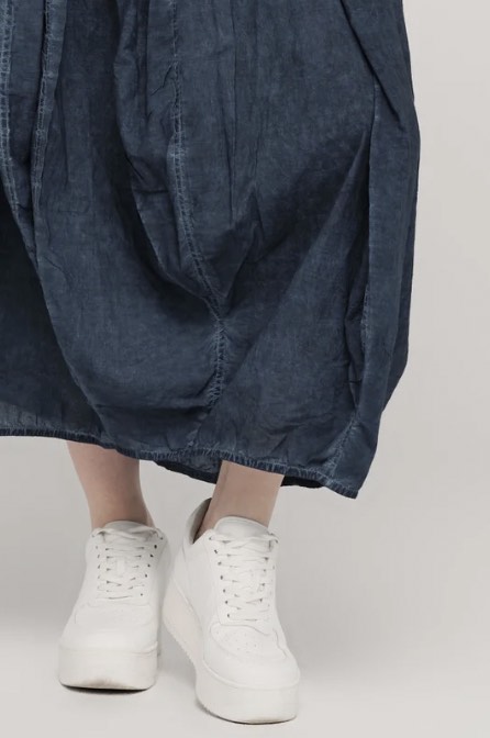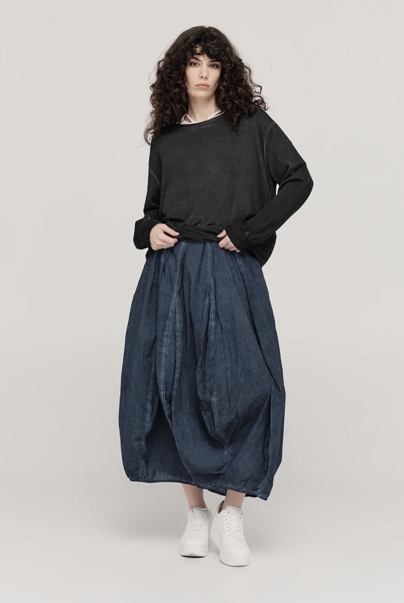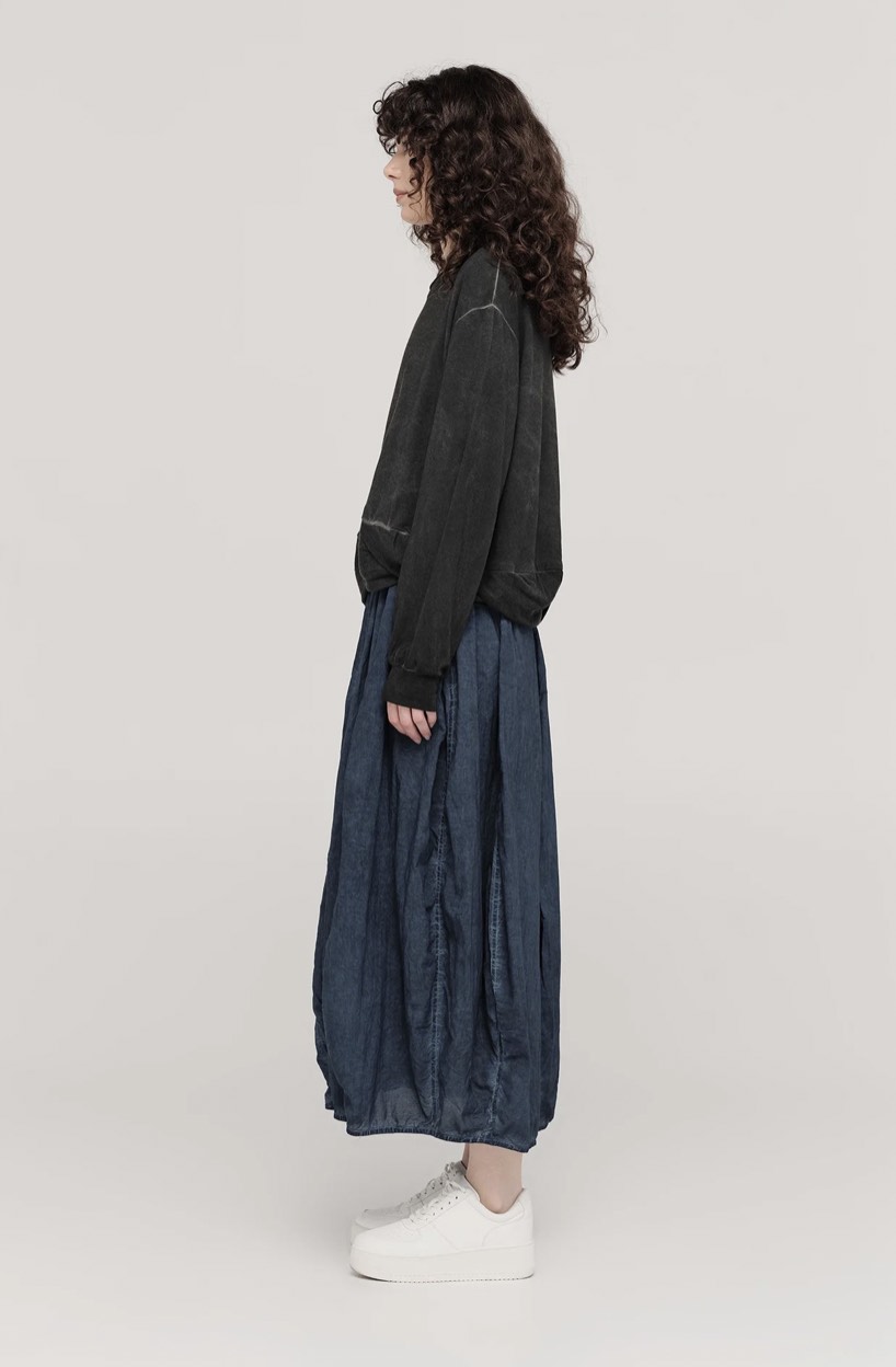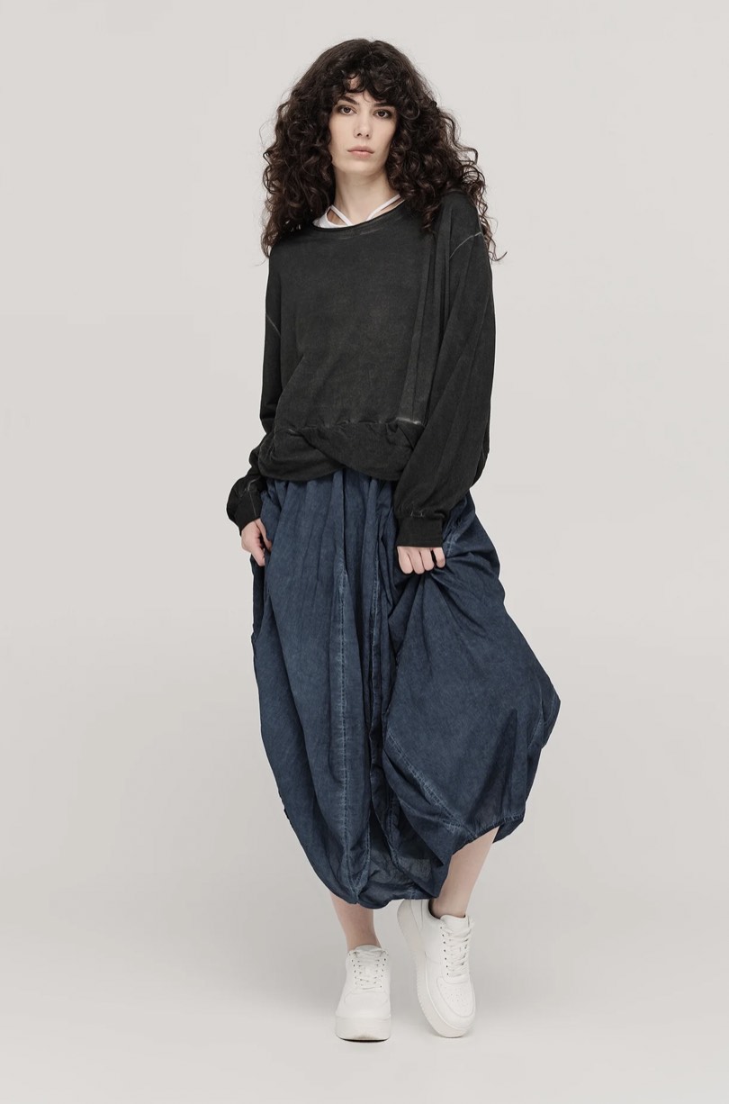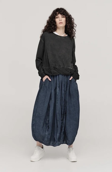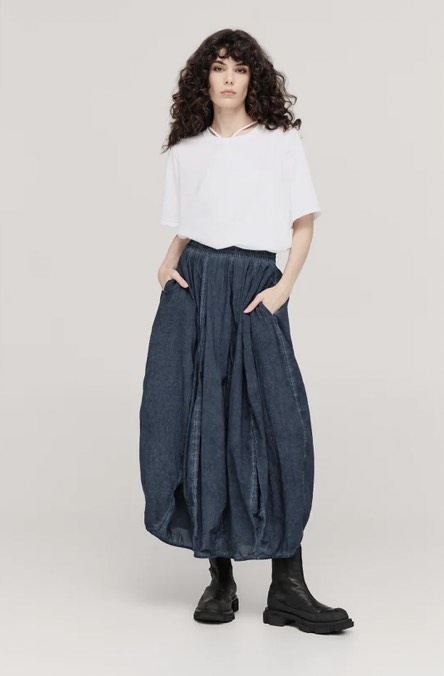 Sculptural volume combined with a flattering, feminine silhouette make the Scope Skirt an exciting wardrobe addition in this season’s cold-dye effect. Created in an light cotton featuring a curved hem and tucked detailing, this skirt is a directional styling option.