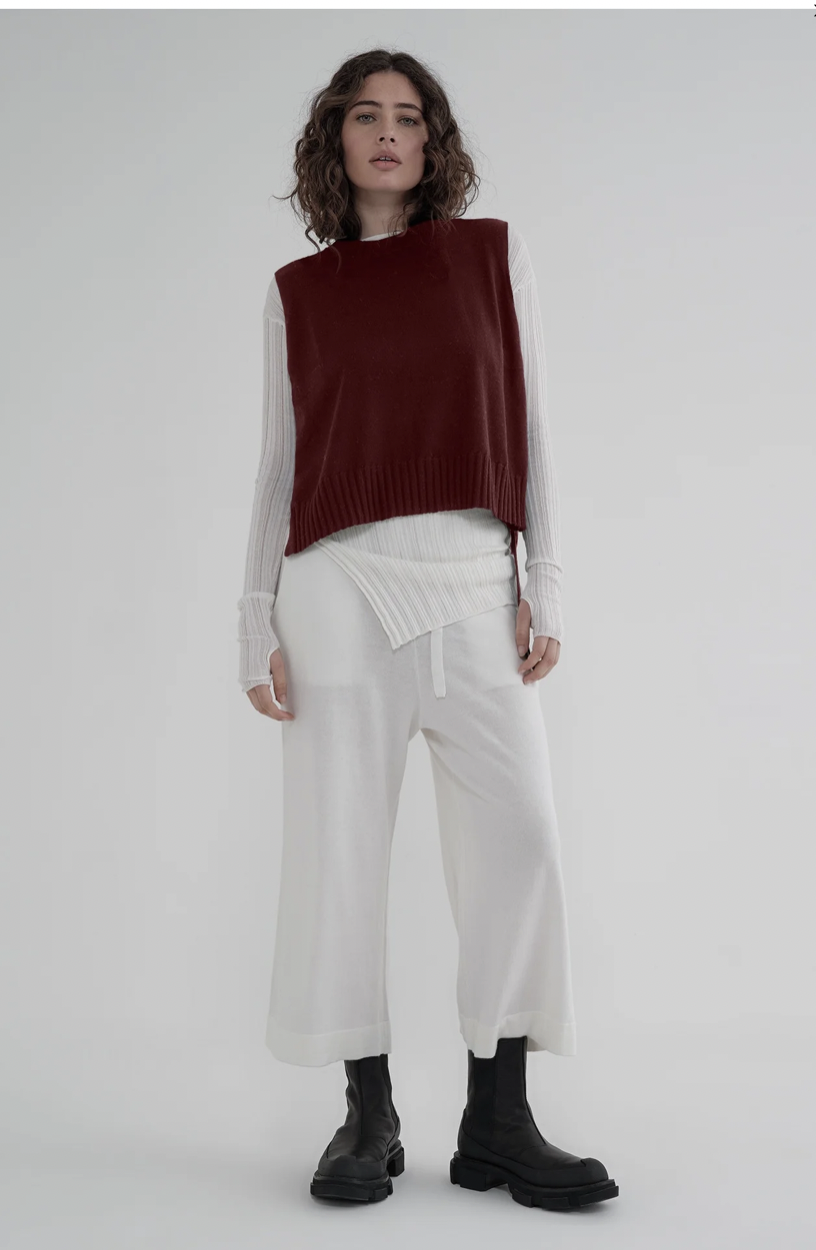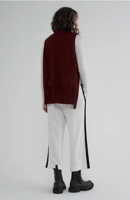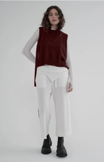 Explore the Recline by taylor realm with the Slot Tunic as an alternative to your classic layering piece. A flattering sleeveless style with a wide rib neckline and hem. From the front and back, it seems like a refined knitted tunic, and from the side, the open tie detail becomes a highlight. Style with the Overt Pant and Splint Shirt as a contrast, letting the Slot Tunic control the volume of the shirt.Â