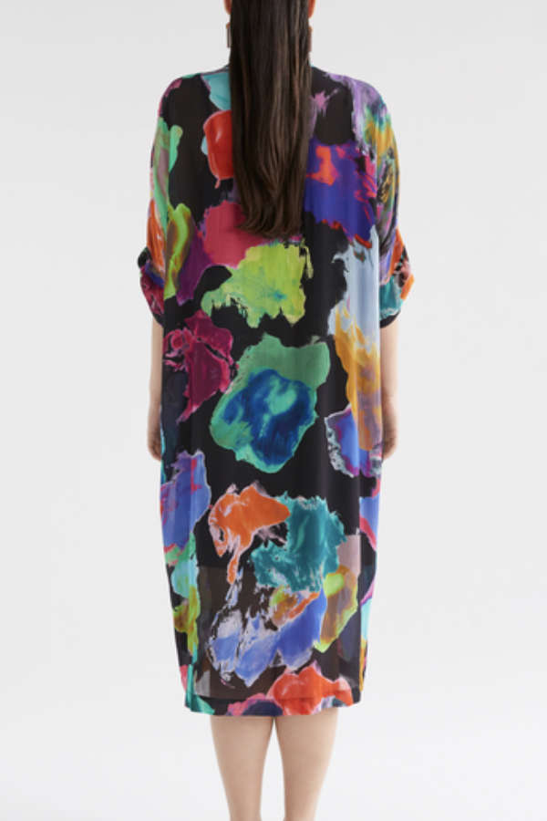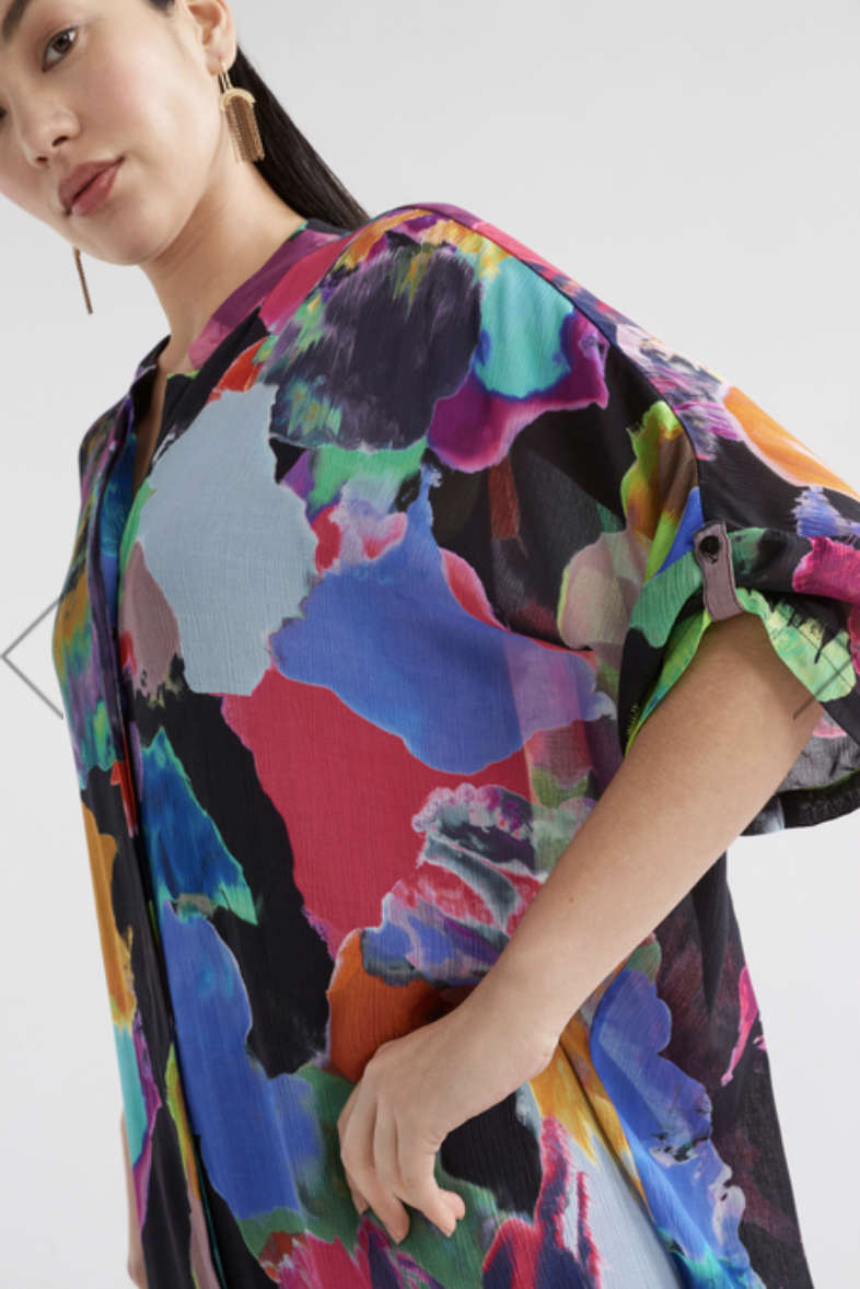 The Soma Shirt Dress is a midi length collarless dress, crafted from a slightly sheer ECOVERO and viscose blend. Considered details such as a concealed button placket, batwing sleeve, and soft wide sleeve cuffs elevate the classic silhouette. The lightweight ECOVERO blend is chosen for its textural hand feel, and sophisticated drape – as well as its standing as an ELK environmentally preferred fibre. This season, the Soma Dress is offered in the seasonal Rem Print. As a yardage print, the placement of the print is unique to each garment.