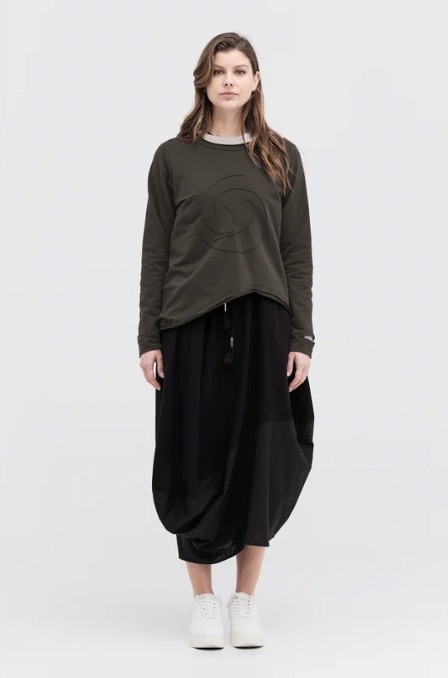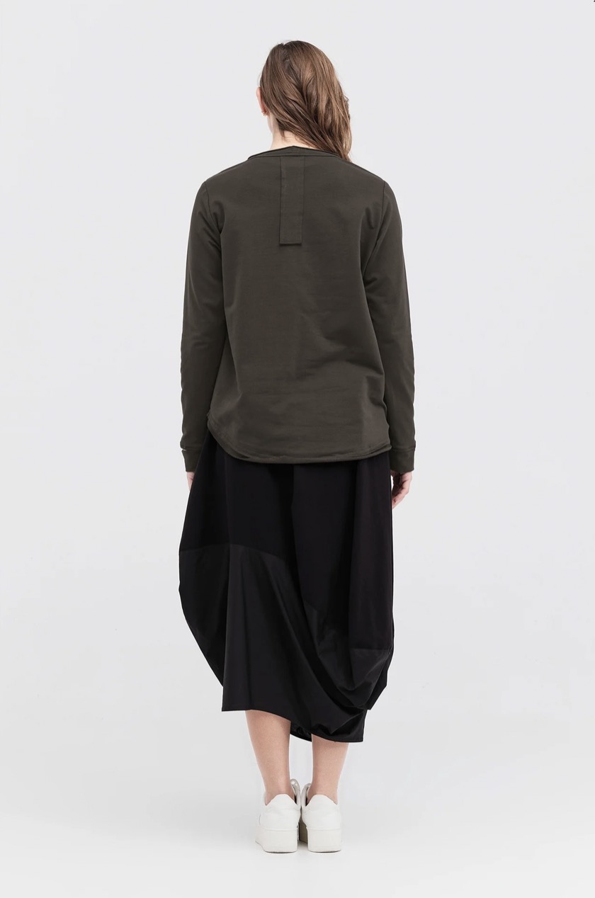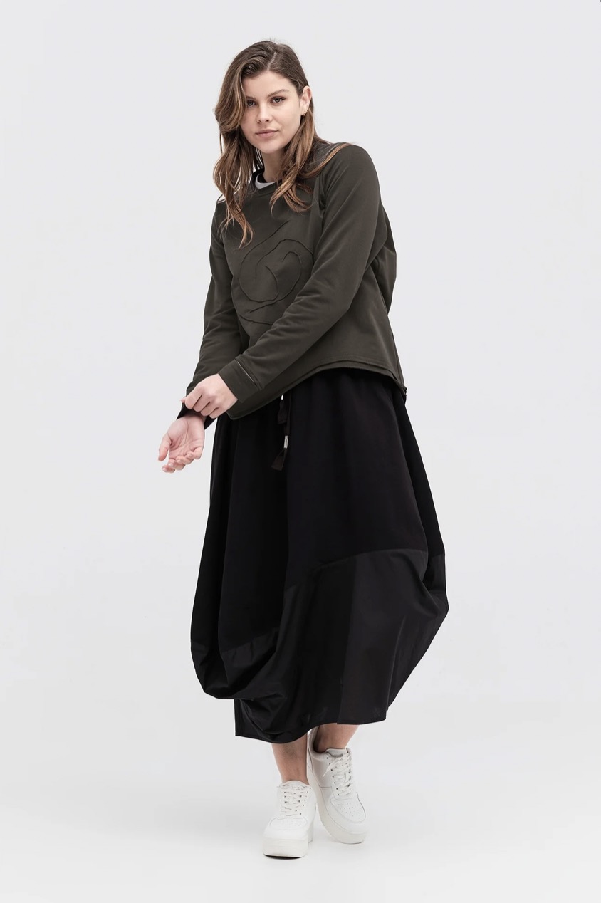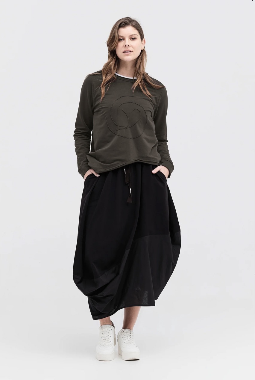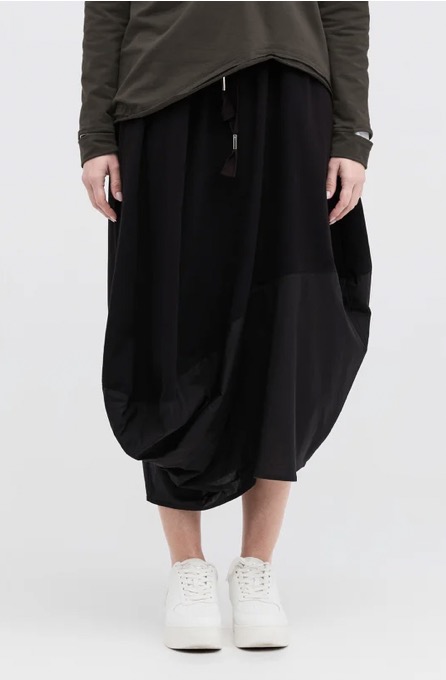 A classic taylor pod shape skirt on an elastic waistband, is a new addition to the taylor vocabulary. The curved detailing in contrast cotton, stays strong for this season, making it easy to style with like minded pieces to compliment the detailing.