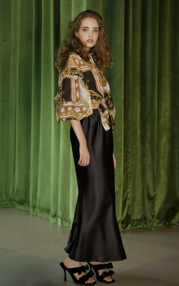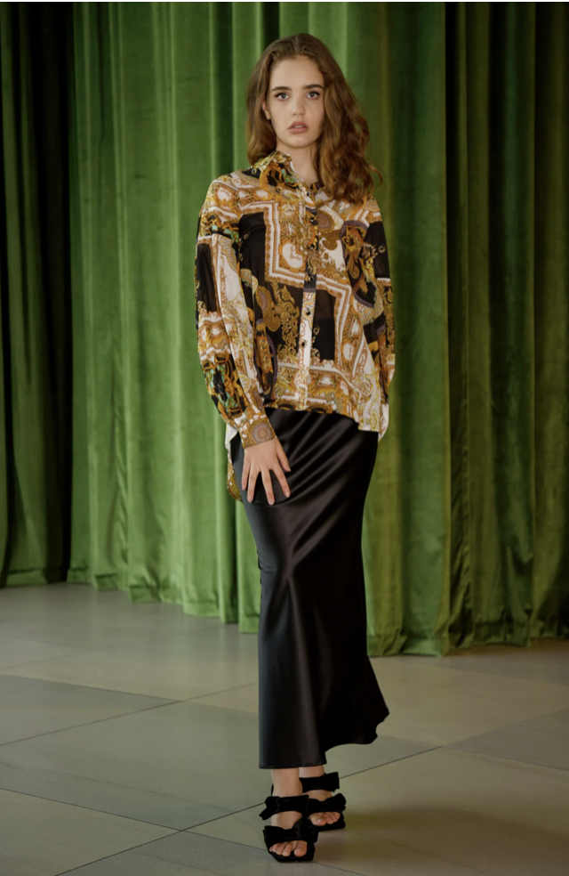Simple and elegant, the ‘Stand Bias Me’ skirt is an essential in every fashionista’s wardrobe. Cut on the bias this skirt follows the contours of the body resulting in a flattering silhouette. Crafted in the slinky ‘Satin Fever’ fabric this skirt lends itself perfectly to semi-formal dressing or team it with a simple t-shirt to transform it into everyday dressing.