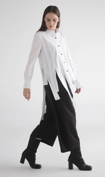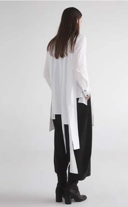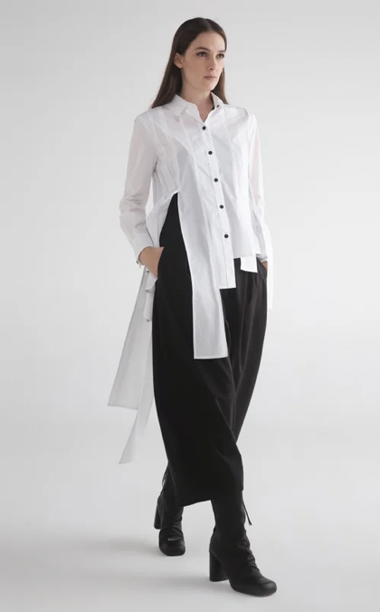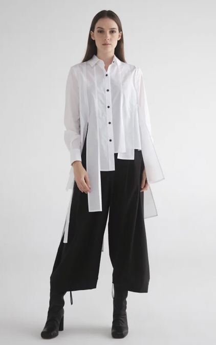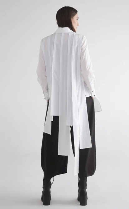 Long linear panels unite together to create an edgy style. The Strategy Shirt is fabricated in a Cotton poplin, enabling the crisp, clean silhouette with a soft drape where the panels fall. Style the Strategy Shirt with the Overtune Pant and the Backless Fusion Jacket to show to hidden fullness in the shirt.