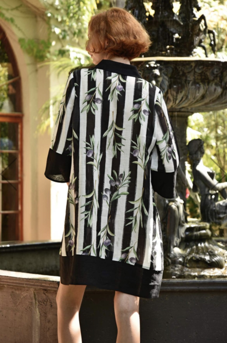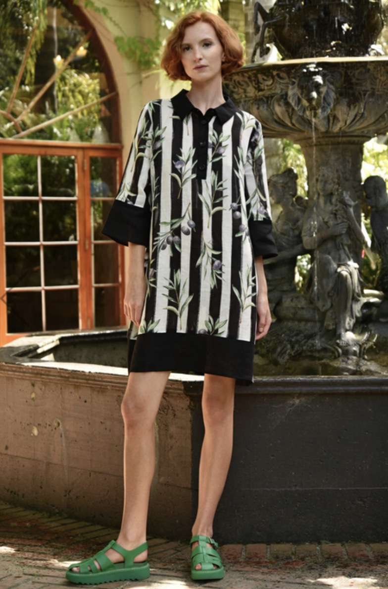 Spotlighting the statement ‘Olive Branch’ striped ramie, the ‘Stripe When it’s Hot’ dress is intelligently designed for work-to-play versatility. Sporting a clean silhouette, contrasting collar, cuffs and hem, this dress can be worn on its own for a shorter length or layered over trousers for a multidimensional look.
