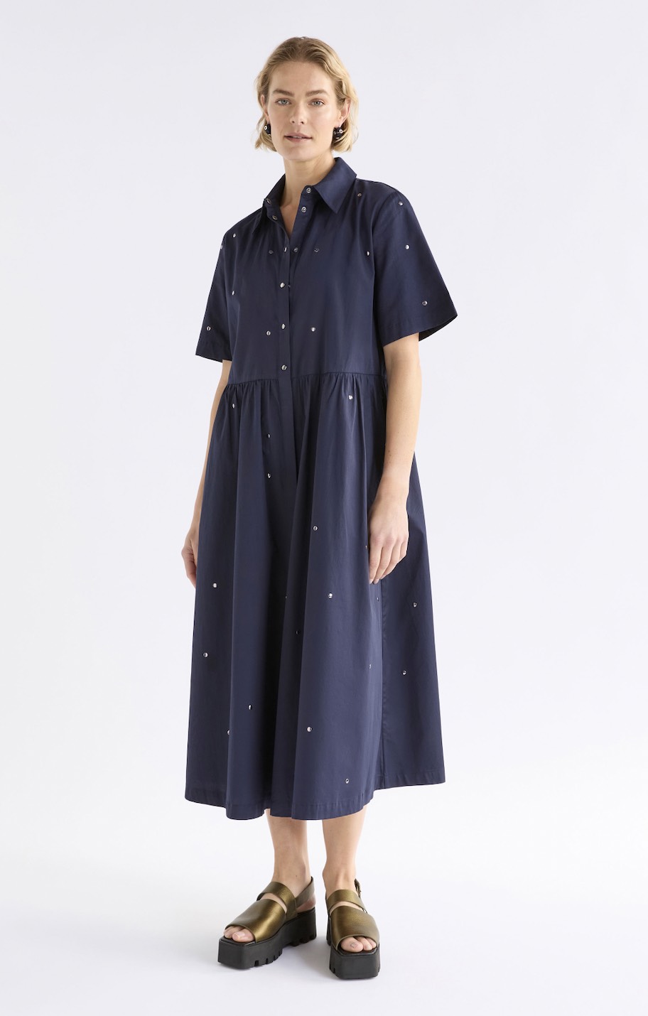 The Stuud Shirt brings a modern edge with distinctive all-over metallic studs. This shirt dress is crafted from organically-grown cotton that is lightweight yet structured.