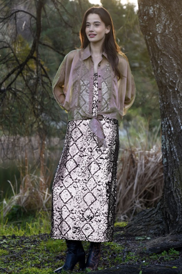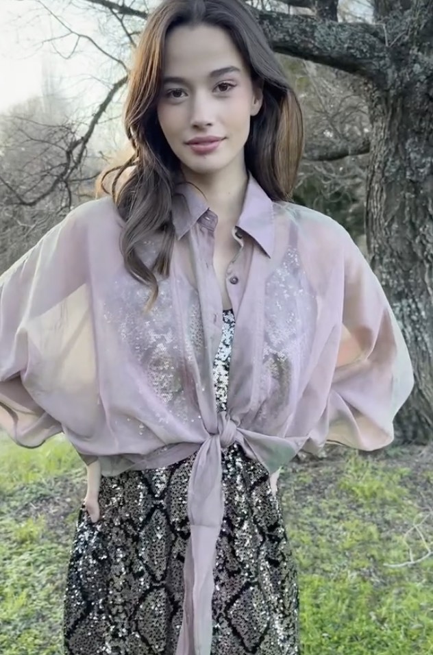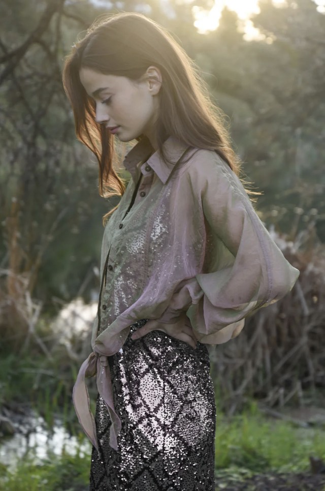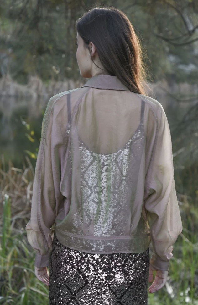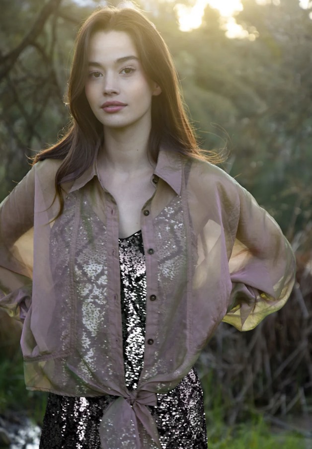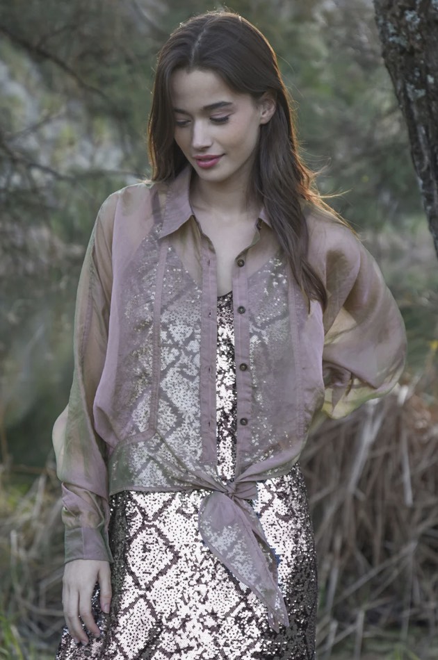 Impossible to ignore, the ‘Tied & Tested’ blouse is your secret weapon for effortless polish with a playful twist. Designed in the ‘Organza Bonanza’ iridescent organza, it features a classic button up front, batwing sleeves, and sheer finish, all about balancing softness with structure. A waist tie cinches into a dramatic bow bringing the right amount of statement to this tailored silhouette. Dress it up, layer it down or let it steal the spotlight on its own.