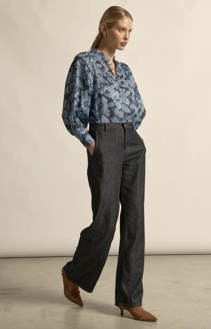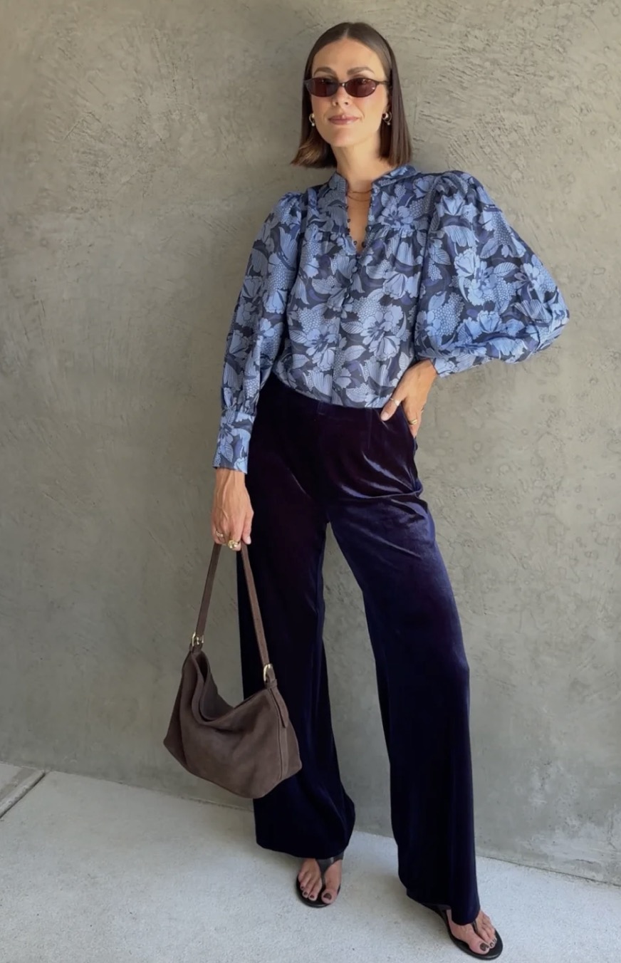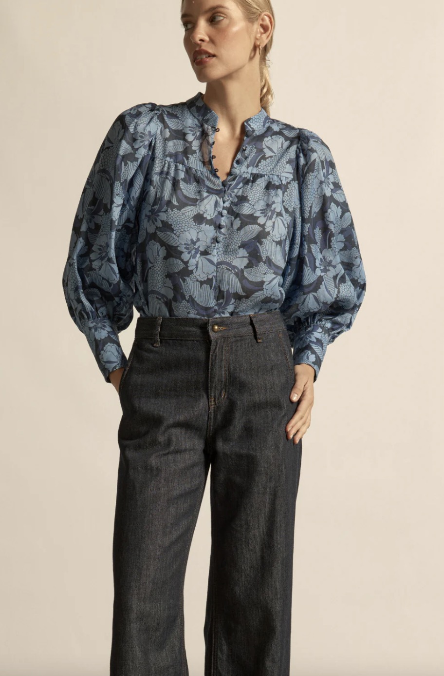 The Vista Top is a refined transitional essential. It balances softness and structure for effortless autumn–winter dressing. a deep blue floral with subtle contrast, moonstone garden offers a refined take on romance with a modern, darker edge.