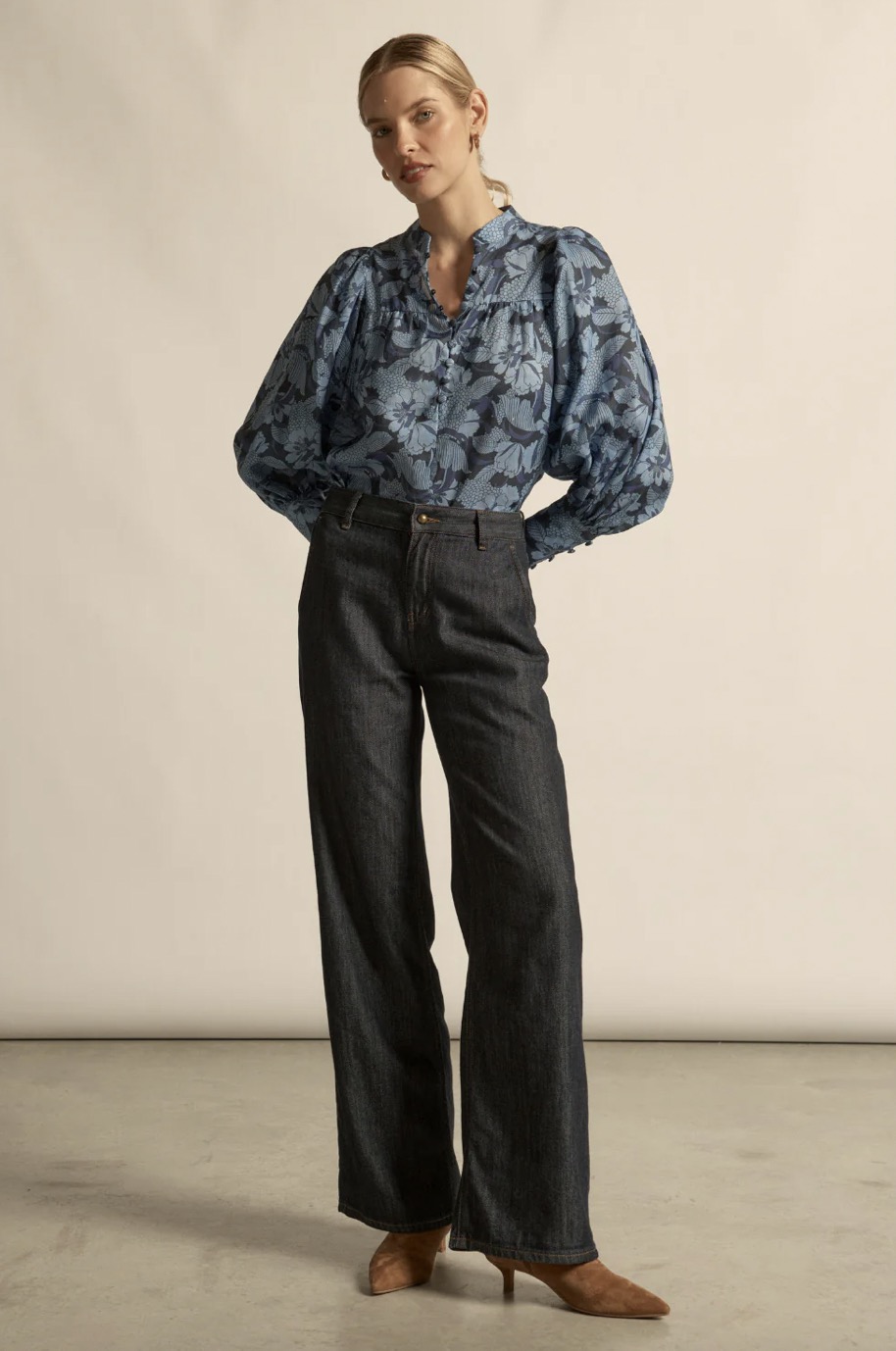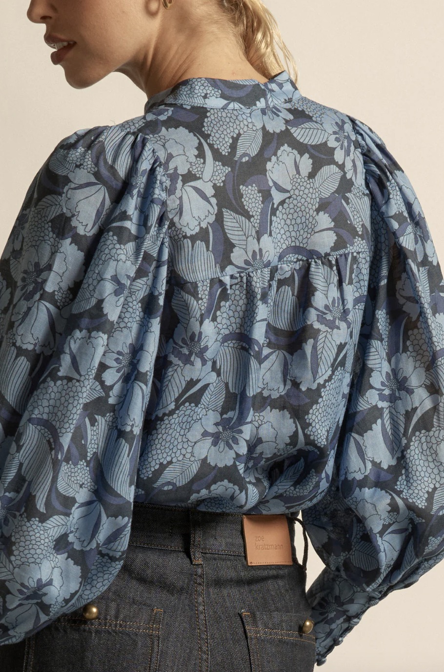 - blouson sleeves finished with a deep cuff for sculptural shape