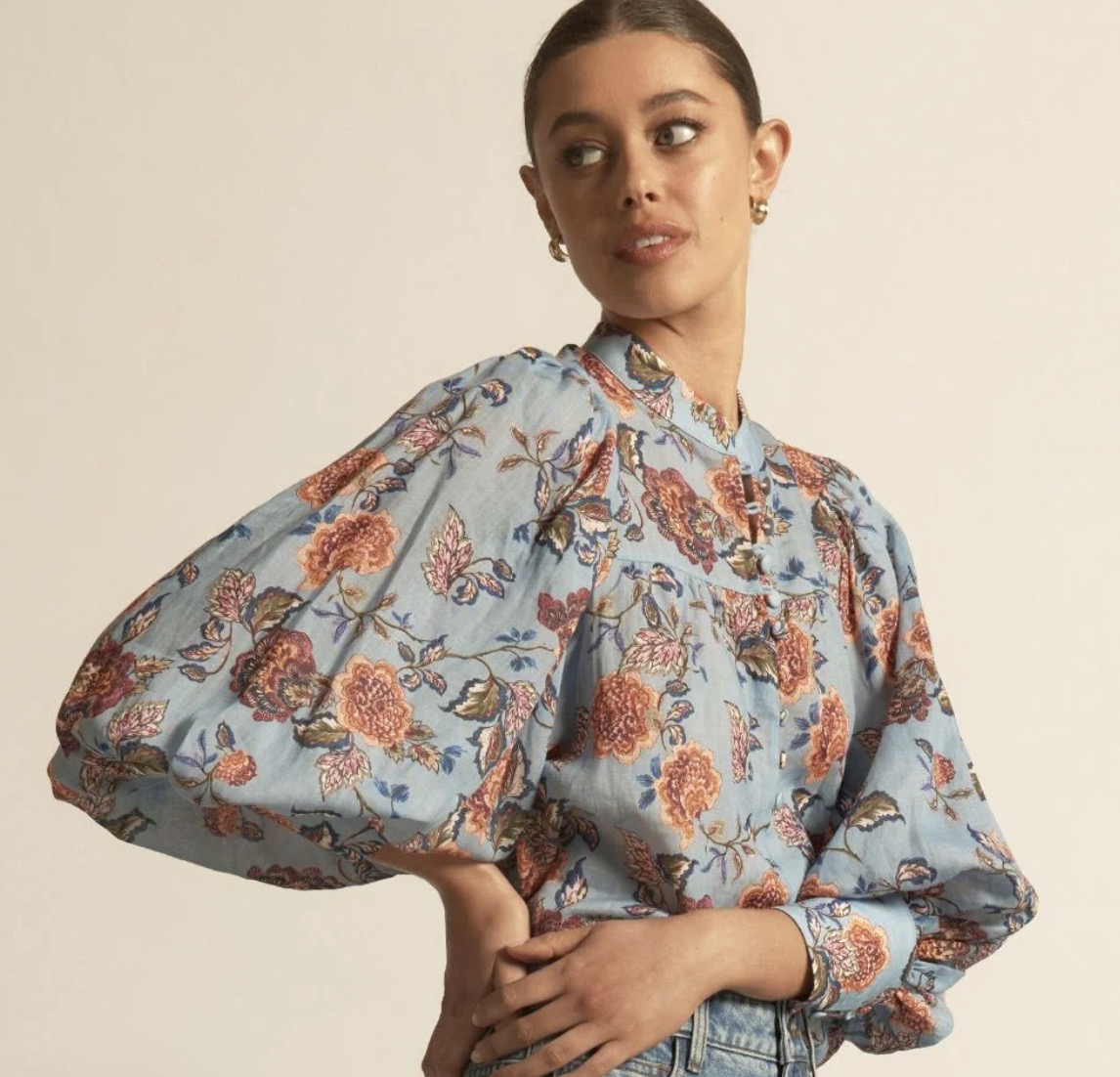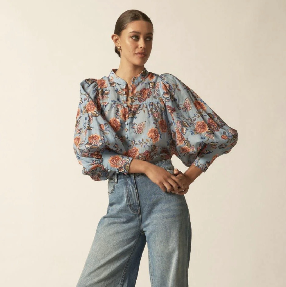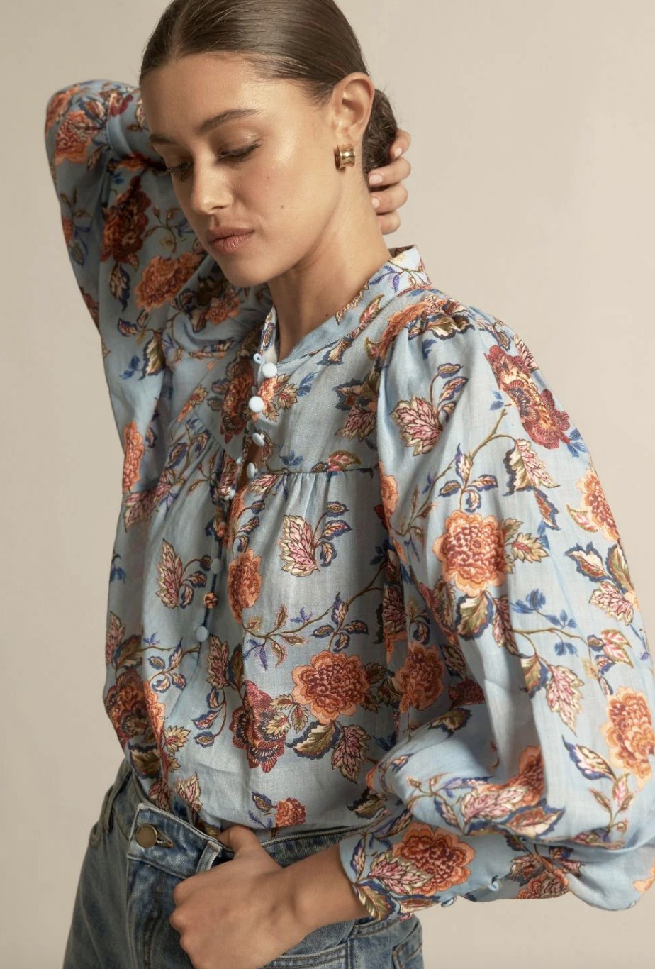 The Vista Top is a refined transitional essential. It balances softness and structure for effortless autumn–winter dressing. a cool blue base softened with warm florals, twilight bloom feels balanced, feminine, and easy to wear.