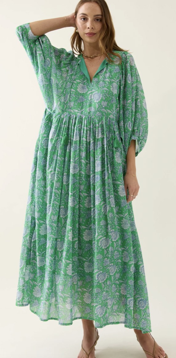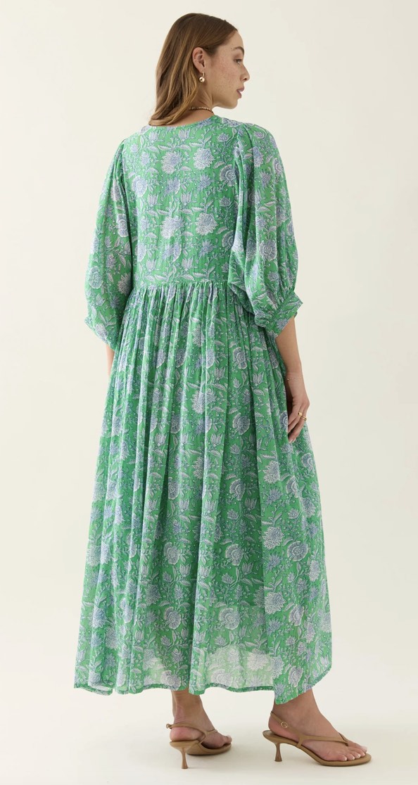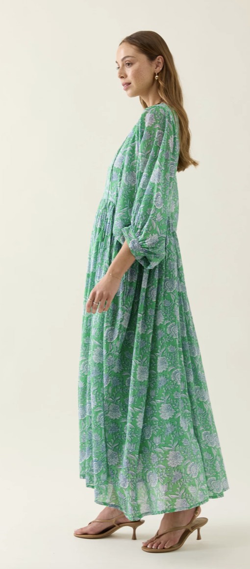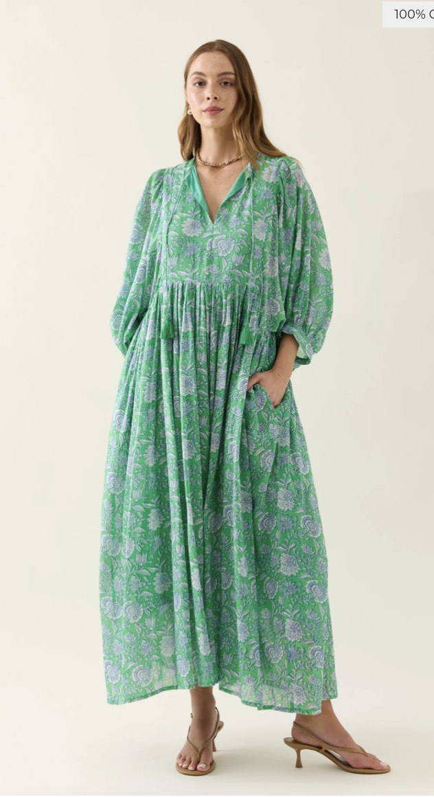 Made from lightweight, hand screen-printed cotton voile, the Wilma Maxi brings softness and ease to your summer wardrobe. Inspired by floral hand-block and featuring a V-neckline, tassel ties, gathered waist and full-length hem. Fully lined for comfort and ready to wear.